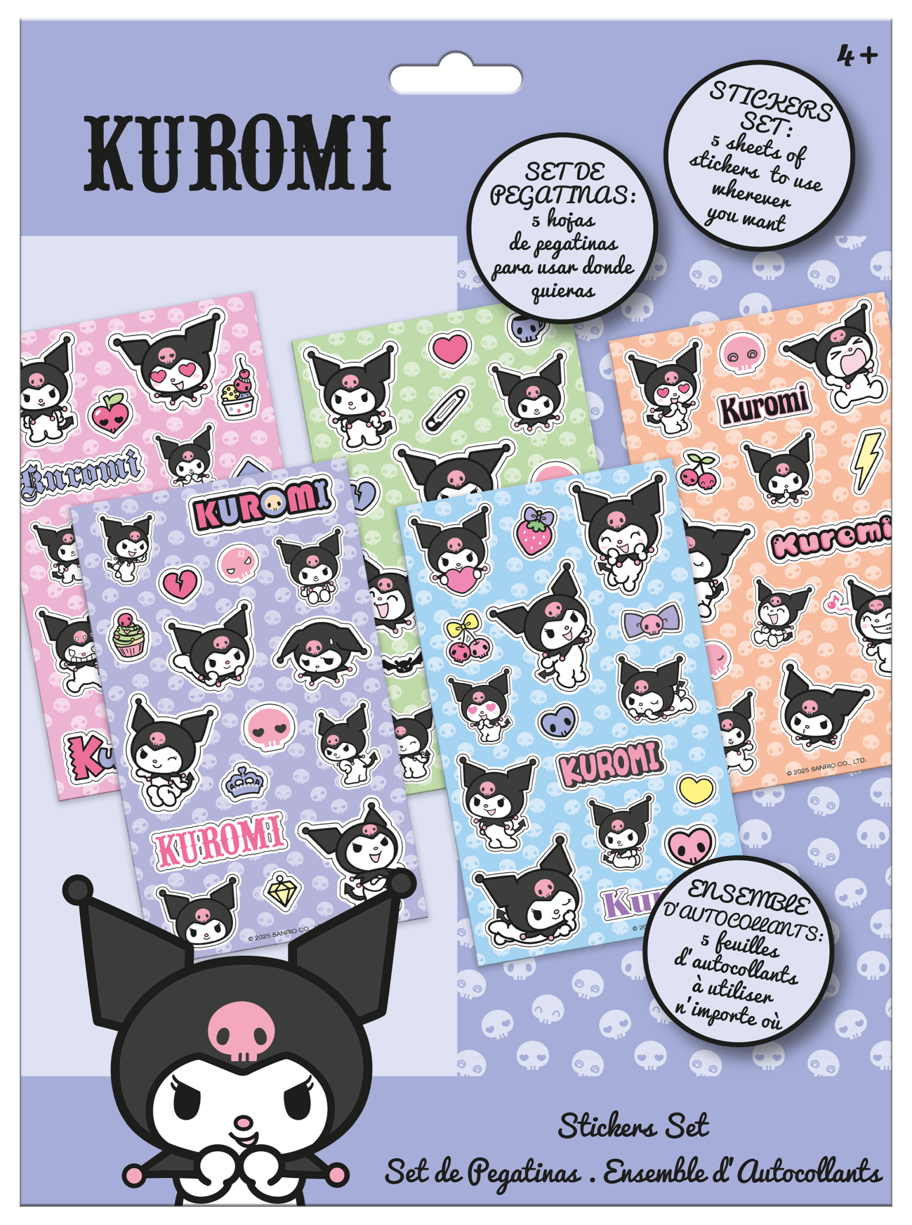 Zestaw z naklejkami z ulubionymi postaciami ze świata Kuromi. • Zestaw naklejek• Materiał: papier• Wymiary: 25x15x0,2 cm• Zawartość: 92 naklejki