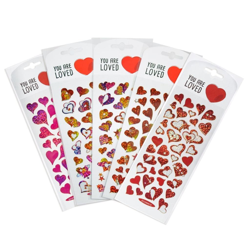 Komplet naklejek na Walentynki na blistrze 20x8,5cm. Mieniące się naklejki w kształcie serduszek. Idealne naklejki do ozdoby walentynki DIY, kartki walentynkowej, laurki. Naklejki do prac kreatywnych, dekoracji, prac szkolnych.