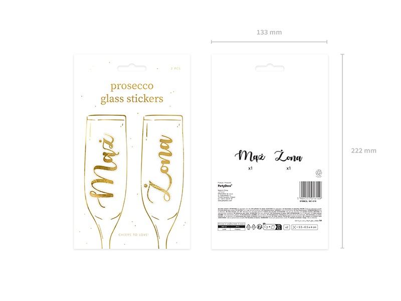 Naklejki na kieliszki ''Mąż i Żona'' w kolorze złotym, zestaw zawiera 2 naklejki na blistrze, wymiary ok. 7.5-8 x 4-4.5 cm.(1 op. / 2 szt.)