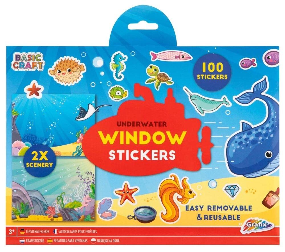 Naklejki okienne, ponad 100 szt. Łatwe do przemieszczenia lub usunięcia z oszklonej powierzchni, można też nakleić na 2 sceny zamieszczone w zestawie. Dostępne w 2 wariantach dla dziewczynek (jednorożec, kwiatki i babeczki) lub chłopców (podwodny świat). Przeznaczone dla dzieci powyżej 3 lat.