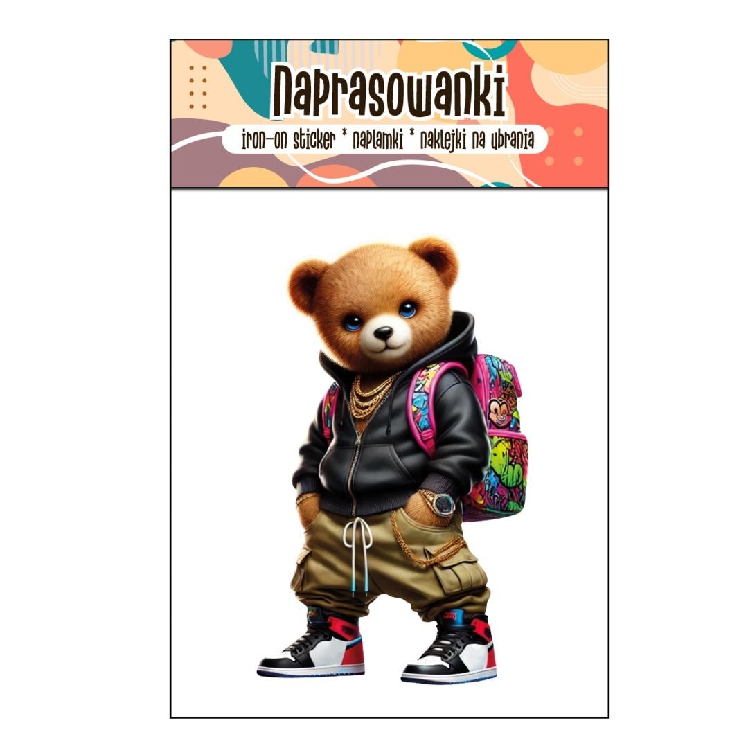 Naprasowanka prezentująca zabawną postać Misia z kolorowym plecakiem.