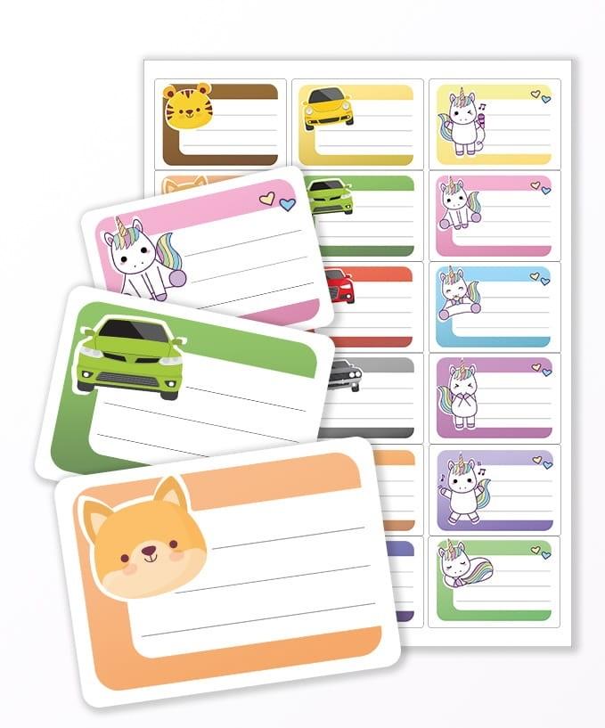Naklejki na zeszyty - "Kolorowy mix" to: 6 różnych samochodzików, 6 różnych jednorożców oraz 6 różnych zwierzątek. W różnych kolorach, które pasują zarówno dla chłopca, jak i dziewczynki.