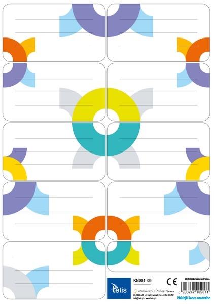 Naklejki na zeszyty i książki z zaokrąglonymi rogami, łatwo usuwalne. Na arkuszu znajduje się 9 etykiet. Jednostka sprzedaży: folia 25 arkuszy.