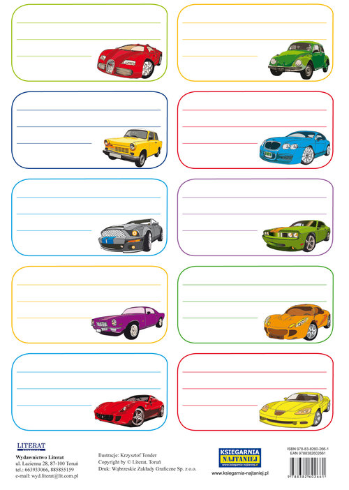 Zestaw 10 naklejek z rysunkami samochodów oraz miejscem na opis do oznaczania zeszytów i książek.