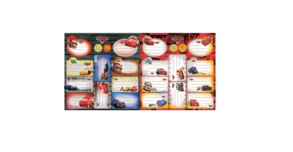 Naklejki na zeszyty w bajkowym motywem Cars. 2 arkusze - każda naklejka posiada miejsce na wpisanie imienia, nazwiska oraz przedmiotu szkolnego.
