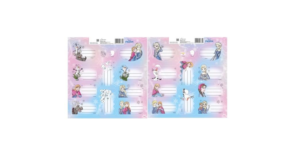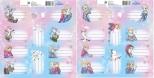 Naklejki na zeszyty z bajkowym motywem Frozen. 2 arkusze - każda naklejka posiada miejsce na wpisanie imienia, nazwiska oraz przedmiotu szkolnego.