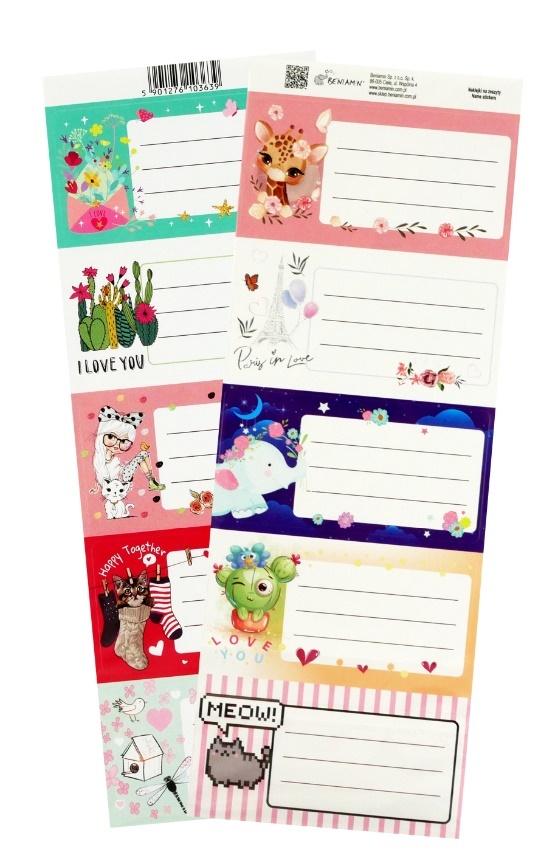 NAKLEJKI NA ZESZYTY - na każdej naklejce miejsce na wpisanie imienia, nazwiska i klasy. Wysokość: 23 cm; szerokość: 9 cm. Dwa arkusze z naklejkami w opakowaniu, na każdym 10 szt. naklejek