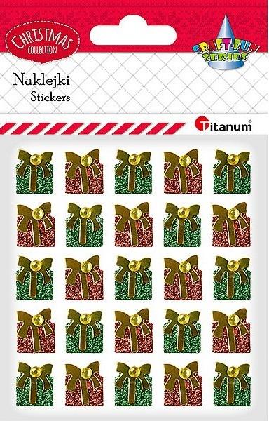 Naklejki dekoracyjne wykonane z papieru klejonego warstwowo, dzięki czemu mają efekt 3D. Wzór: prezenty brokatowe z kryształkiem. Kolor: czerwono-złote, zielono-złote. Wymiary: 14 x 15 mm. Blister: 25 szt.