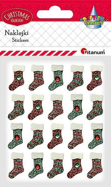 Naklejki dekoracyjne wykonane z papieru klejonego warstwowo, dzięki czemu mają efekt 3D. Wzór: skarpety świąteczne. Kolor: czerwono-zielono-białe. Wymiary: 15 x 25 mm. Blister: 20 szt.