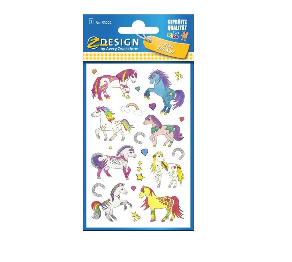 22 szt. Naklejek w opakowaniu, papierowe, trwały klej, z motywem koników. Naklejki skierowane do dzieci - do zabawy, nauczania i kreatywności.