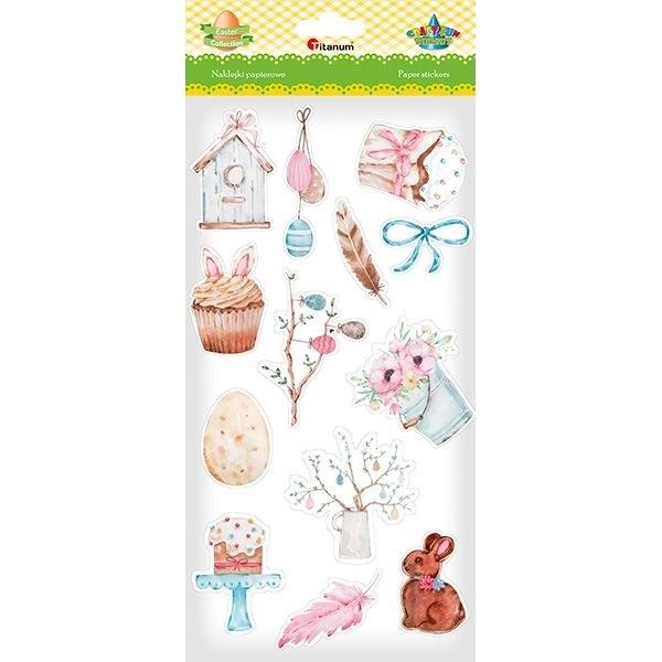 Naklejki papierowe: dekoracje wielkanocne, muffiny, piórka, królik z czekolady, 13 szt.
