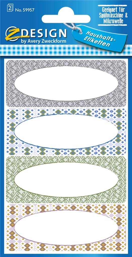 Etykiety samoprzylepne. Można myć w zmywarce i używać w kuchence mikrofalowej; Do napisów stosować markery permanentne.