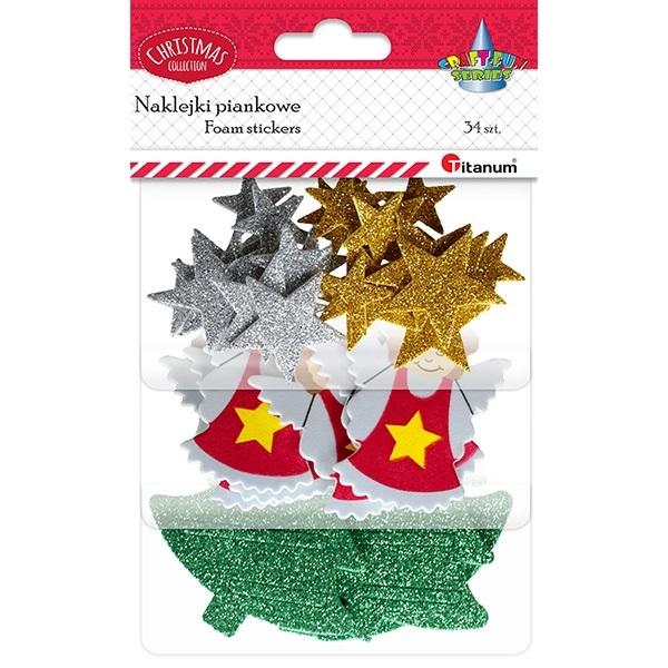 Naklejki piankowe brokatowe gwiazdki złote/srebrne 35x33/24x23mm, aniołki matowe 48x65mm, choinki zielone 66x70mm 34szt.