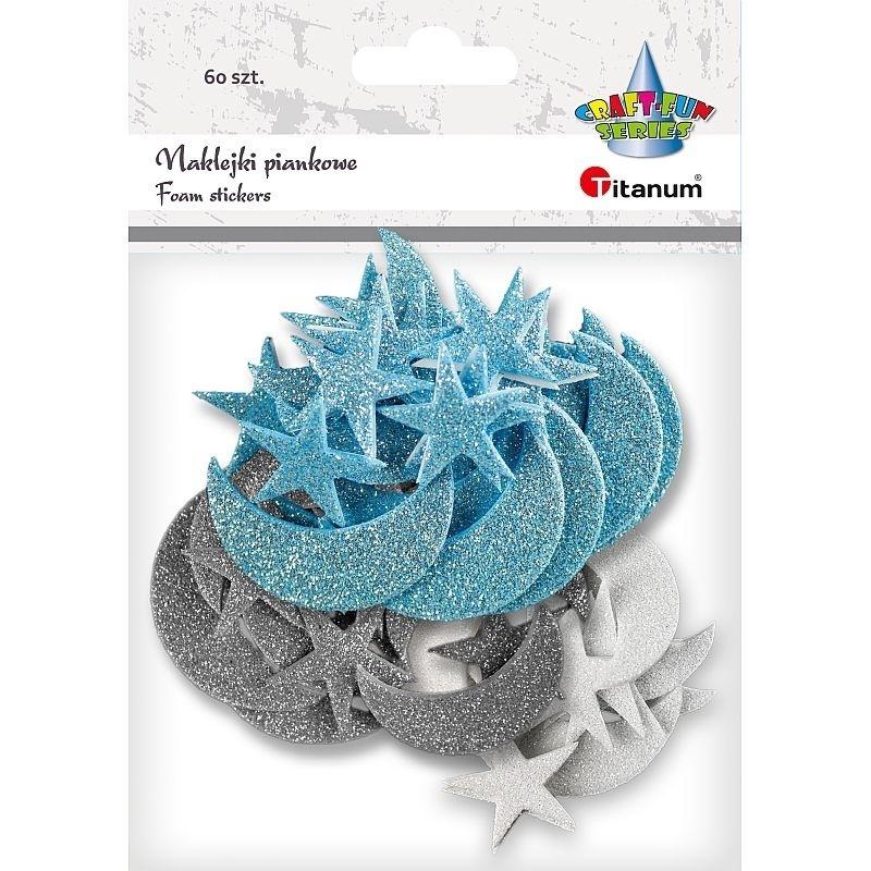 Naklejki piankowe brokatowe księżyce 15x42/12x35mm, gwiazdy 21x21mm niebieskie, srebrne, białe 60szt.