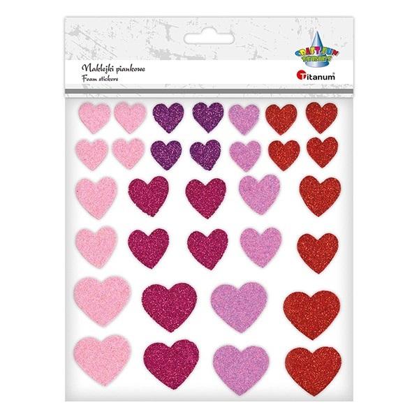 Naklejki piankowe - brokatowe serca: 20 x 20, 22 x 26, 35 x 36 mm. Jasnoróżowe, fuksjowe, wrzosowe, czerwone, 32 szt.