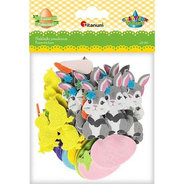 Naklejki piankowe zające 27 x 59 mm, marchewki 15 x 32 mm, natki marchewki 20 x 22 mm, pisanki 32 x 47 mm, kurczaczki 30 x 32mm, 48 sztuk.