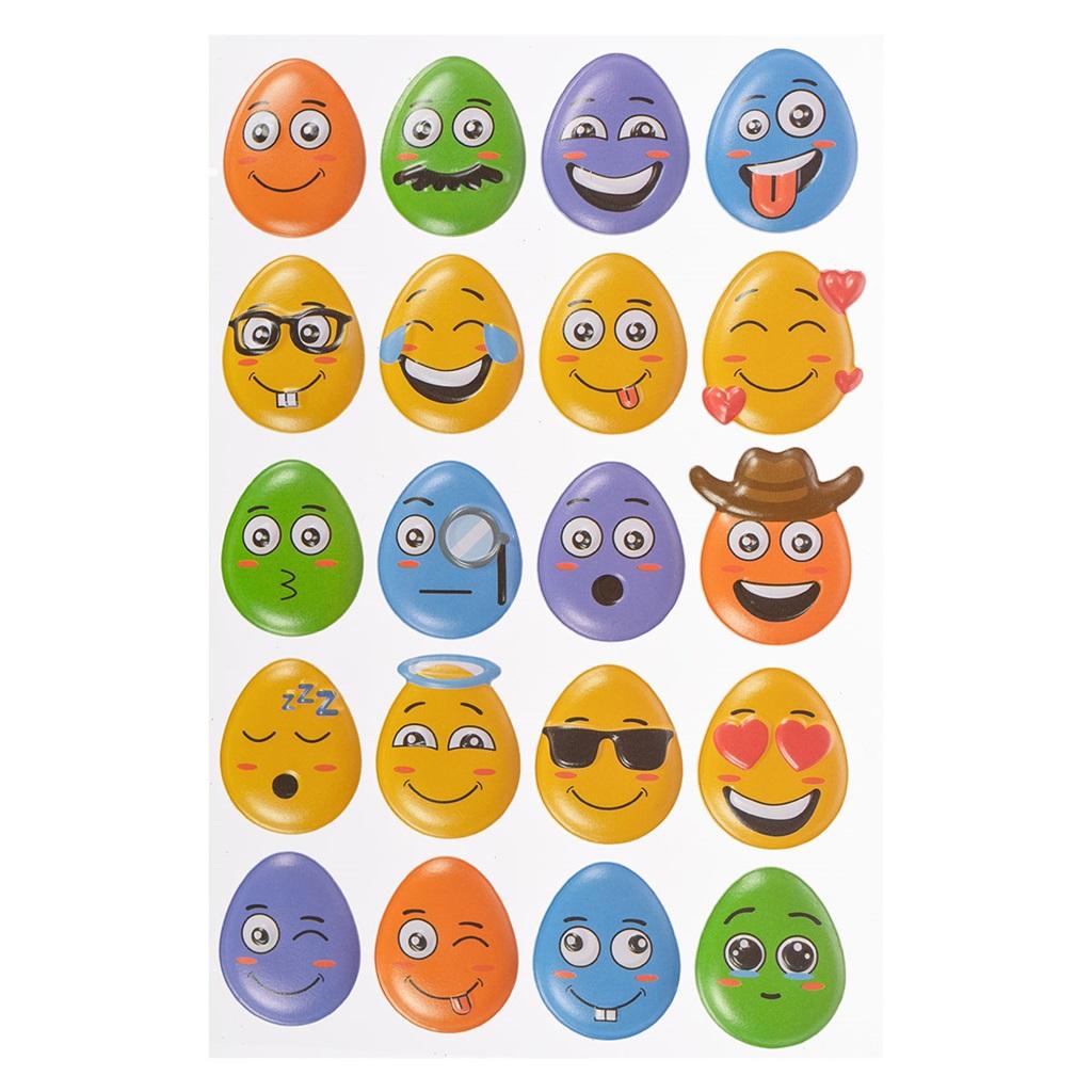 Zabawne naklejki z wesołymi buźkami. Naklejki w kształcie pisanek emotek. Śmieszny element do dekoracji kartek świątecznych, prac szkolnych. Naklejki na blistrze o wymiarze 10 cm.