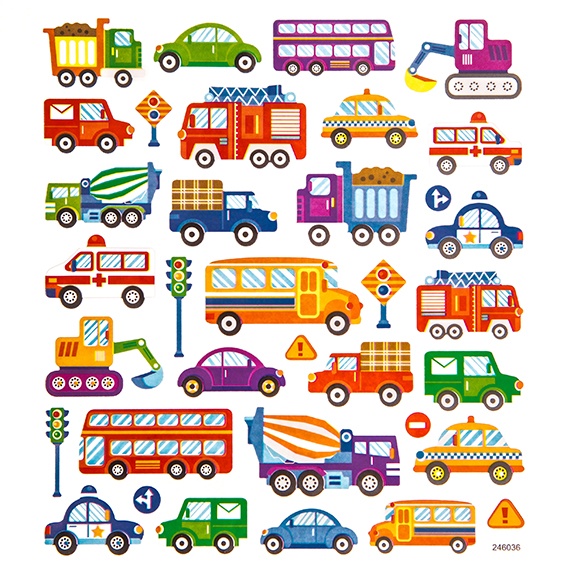 Foliowe naklejki z wizerunkami miejskich pojazdów takich jak taksówki, autobusy, straż pożarna i ambulans ale także samochody dostawcze czy koparki.