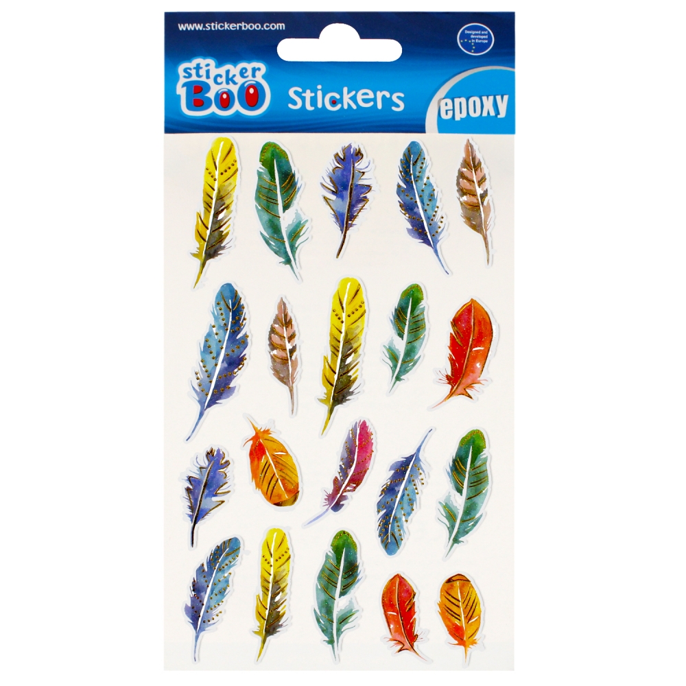 Naklejki STICKER BOO z grafiką w brokatowe piórka z pewnością przypadną do gustu dzieciakom, idealne do zdobienia rysunków, wszelkiego rodzaju prac plastycznych oraz kolekcjonowania. Na blisterku znajduję się 20 szt. naklejek.