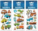Naklejki przedstawiające różnego rodzaju pojazdy: rower, samochód, statek, samolot.