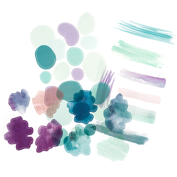 Naklejki PVC matowe, z przezroczystym tłem. Wzór: akwarelowe kształty w pastelowych kolorach, doskonałe jako etykiety.