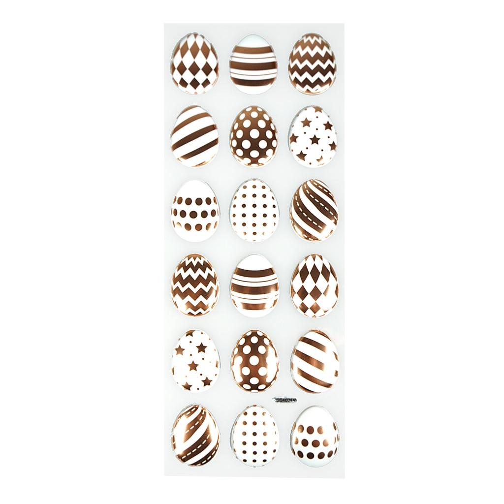 Naklejki z wielkanocnymi motywami w eleganckich kolorach bieli, czerni i złota. Naklejki pisanki 3D, wypukłe w różnorodne wzory. Idealne do wielkanocnych dekoracji, kartek świątecznych, prac szkolnych. Naklejki na blistrze o wymiarach 305x105 cm.