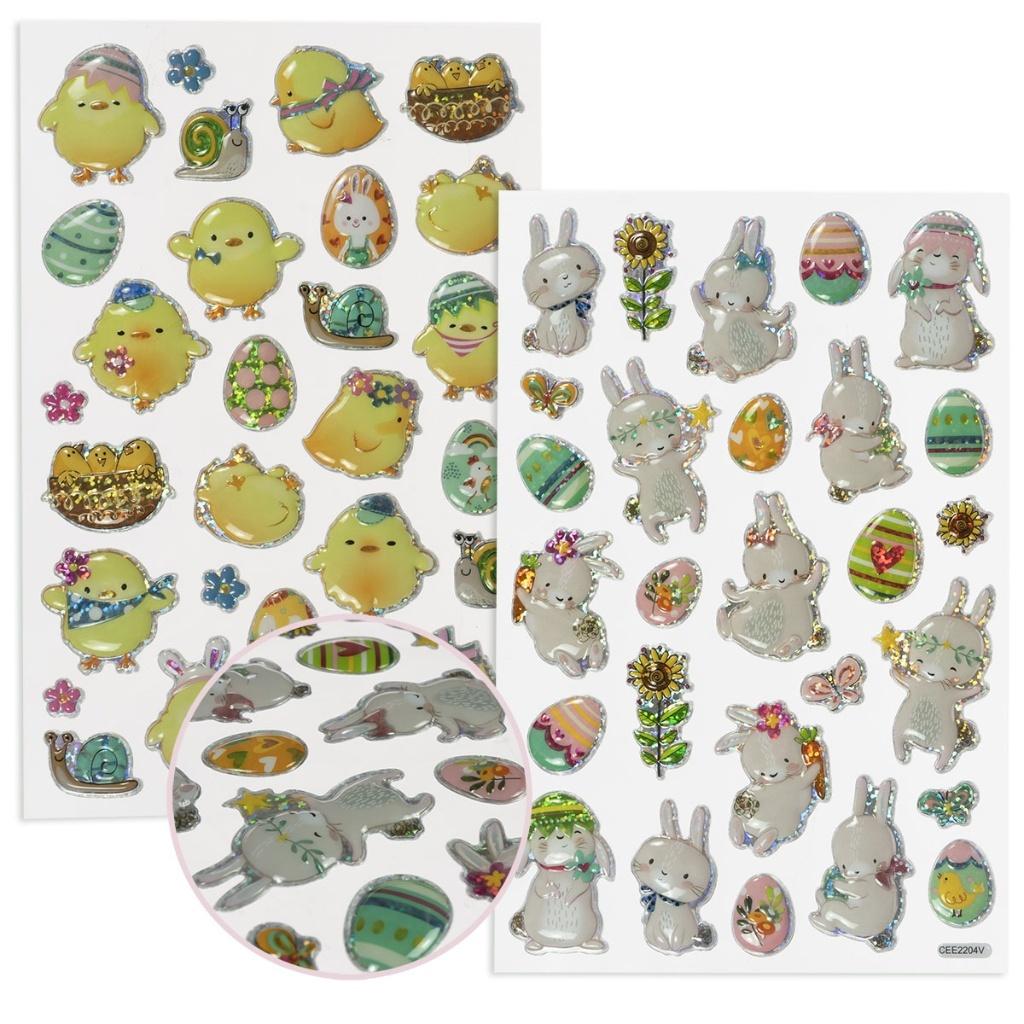 Wielkanocne naklejki mix na arkuszu 14x21 cm to wypukłe wzory z motywem zajączka i kurczaczka. Dzięki przestrzennej formie idealnie nadają się do tworzenia efektownych, wielowymiarowych dekoracji na kartkach, stroikach czy koszykach.