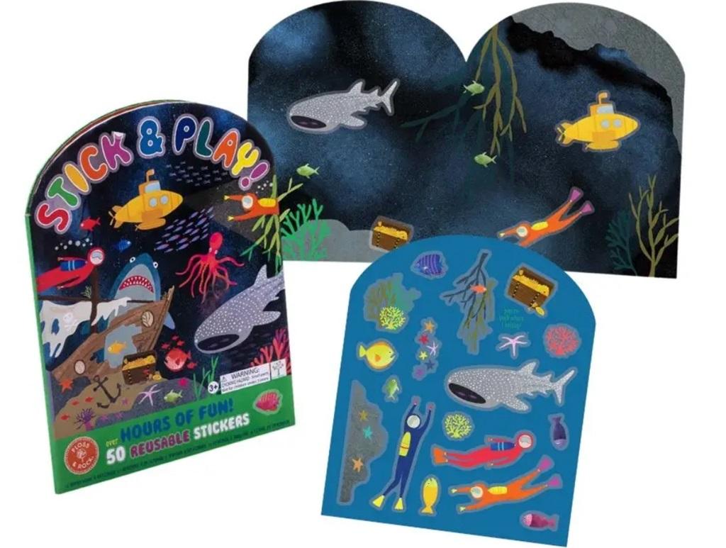 Zestaw Naklejek Wielokrotnego Użytku z planszami to świetna zabawa i nauka jednocześnie. W skład zestawu wchodzi ponad 50 zabawnych naklejek, w tym płetwonurków, rekiny, rozgwiazdy, skarby piratów i wiele innych, oraz 2 rozkładane plansze ilustrujące morska głebinę do tworzenia i wymyślania historii za pomocą naklejek. Naklejki można łatwo umieszczać, nakładać na siebie i zmieniać ich położenie. Dodatkową atrakcją jest dopasowywanie naklejek do ich kształtów na kartach do przechowywania, co zapewni maluchom rozrywkę na długie godziny! Zestaw daje dzieciom nieograniczone możliwości wyrażania swojej kreatywności, ćwiczy koncentrację i wyobraźnię, a także rozwija małą motorykę. Zapakowany jest w twardą okładkę, składa się całkowicie na płasko, dzięki czemu idealnie sprawdzi się w podróży.                                                                                                                                                  Cechy: