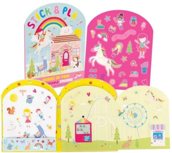 Zestaw Naklejek Wielokrotnego Użytku z planszami to świetna zabawa i nauka jednocześnie. W skład zestawu wchodzi ponad 50 zabawnych naklejek, w tym kolorowe wróżki, jednorożce, miś z hula-hoop, wesołe zwierzaki i wiele innych, oraz 2 rozkładane plansze ilustrujące bajkowy świat tęczowych wróżek do tworzenia i wymyślania historii za pomocą naklejek. Naklejki można łatwo umieszczać, nakładać na siebie i zmieniać ich położenie. Dodatkową atrakcją jest dopasowywanie naklejek do ich kształtów na kartach do przechowywania, co zapewni maluchom rozrywkę na długie godziny! Zestaw daje dzieciom nieograniczone możliwości wyrażania swojej kreatywności, ćwiczy koncentrację i wyobraźnię, a także rozwija małą motorykę. Zapakowany jest w twardą okładkę, składa się całkowicie na płasko, dzięki czemu idealnie sprawdzi się w podróży.                                                          Cechy: