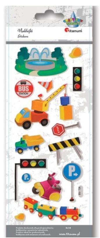 Naklejki wypukłe miękkie pojazdy budowlane, znaki drogowe, sygnalizatory świetlne, fontanna 16szt.