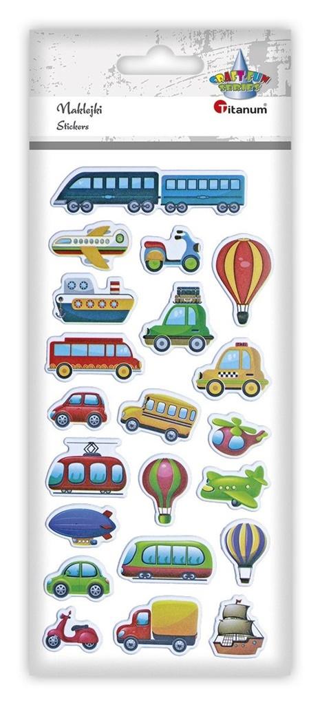 Naklejki wypukłe miękkie pojazdy jeżdżące, latające, pływające 21szt.