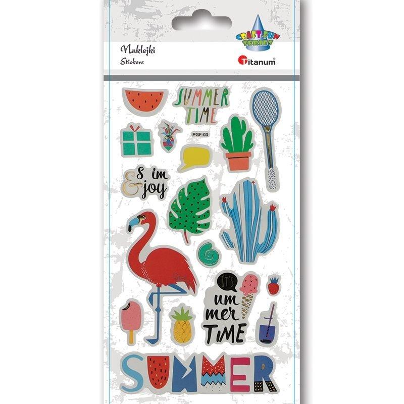 Naklejki dekoracyjne, wypukłe. Wzór: lato: flaming, napoje, kaktusy, rakieta do badmintona, arbuz. 18 sztuk.