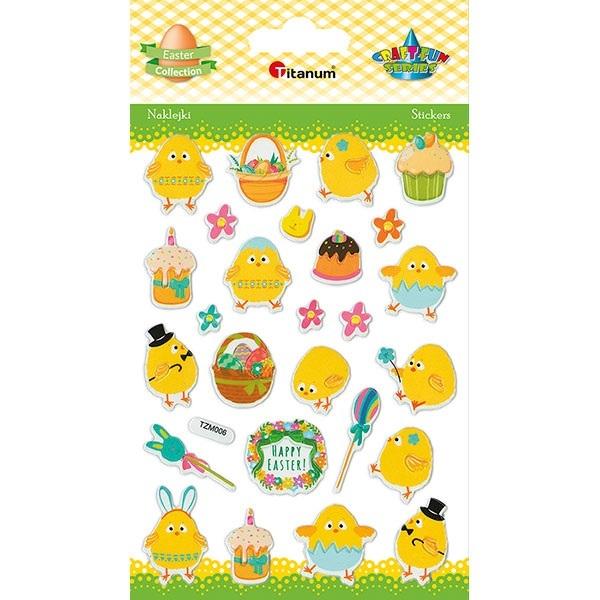 Naklejki wypukłe: kurczaczki, pisanki, koszyczki wielkanocne, muffiny, lizaki, wianek, 26 sztuk.