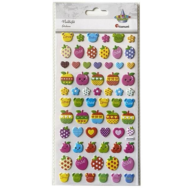 Naklejki wypukłe: głowy misia, truskawki, jabłka, serca, kwiaty - 65 sztuk.