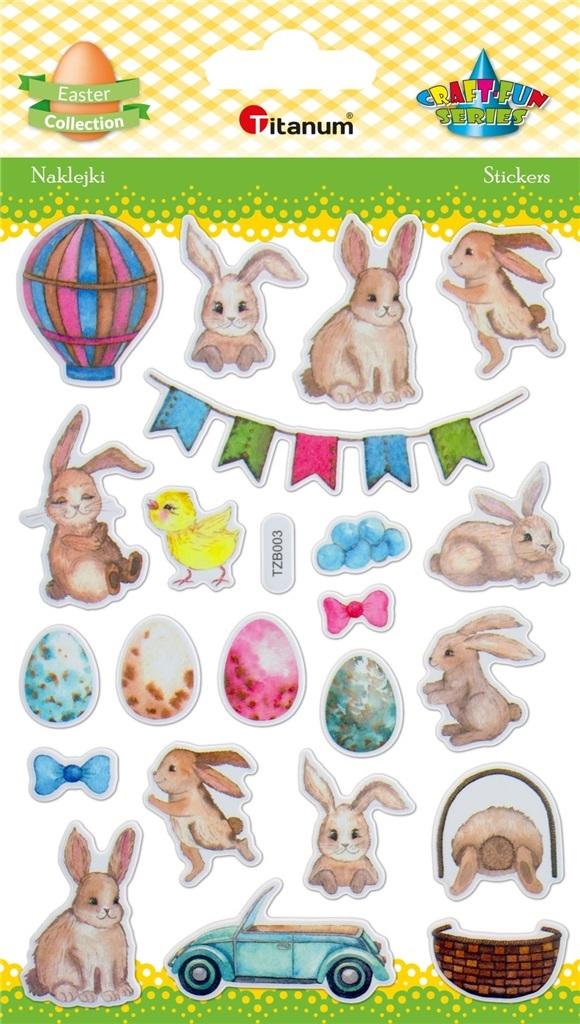 Naklejki wypukłe, wzory: zajączki, pisanki, balon, proporczyk, samochód. 22 sztuki.