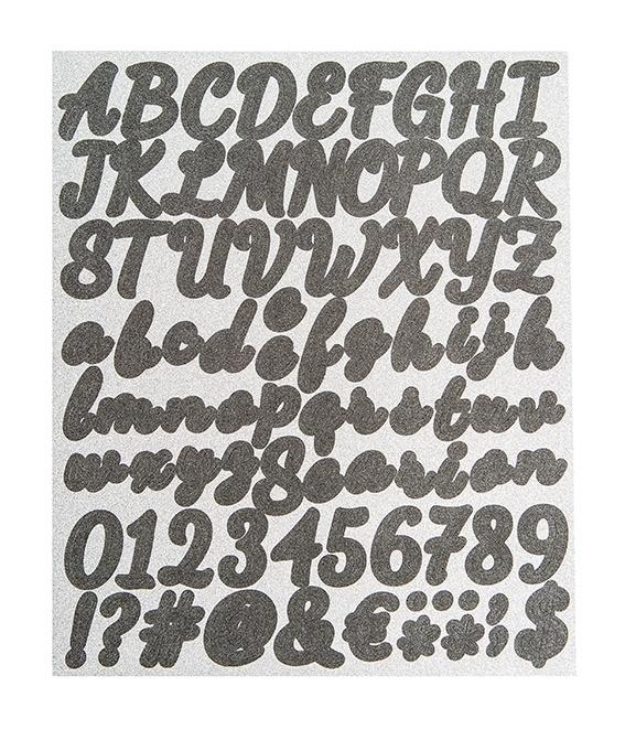 Naklejki papierowe z brokatem, z czarnymi literkami (alfabetem) oraz cyframi i znakami specjalnymi to doskonałe uzupełnienia prac kreatywnych w stylu glamour.