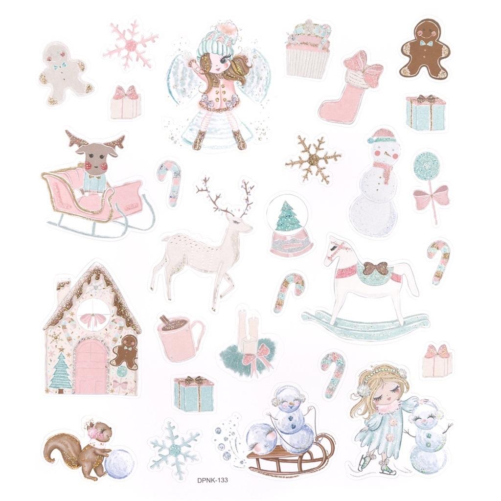 Naklejki ze świątecznymi motywami z zimowej kolekcji Frosty Pastels. Uroku i oryginalności nadają im pastelowe kolory oraz opalizujący brokat.