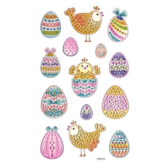Naklejki z kryształkami z wzorami wielkanocnych jajek (11 sztuk) i zabawnych kurek (3 sztuki), idealne do zdobienia kartek okolicznościowych. Mogą też być piękną ozdobą np. na telefon, czy inną gładką powierzchnię.