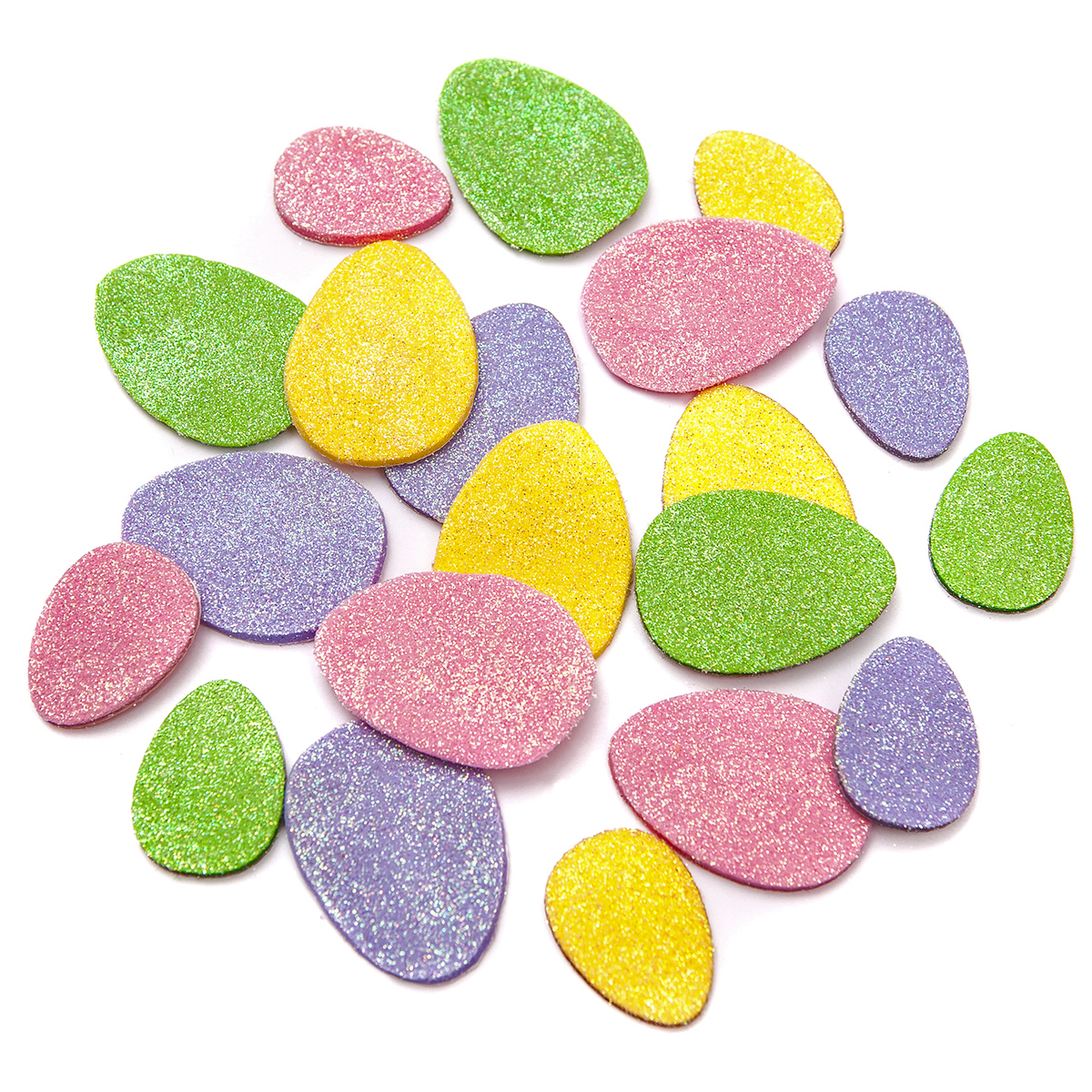 Brokatowe naklejki z pianki w kształcie jajek w czterech pastelowych kolorach doskonale nadaja się także do rozwijania kreatywnej aktywności dziecięcej.