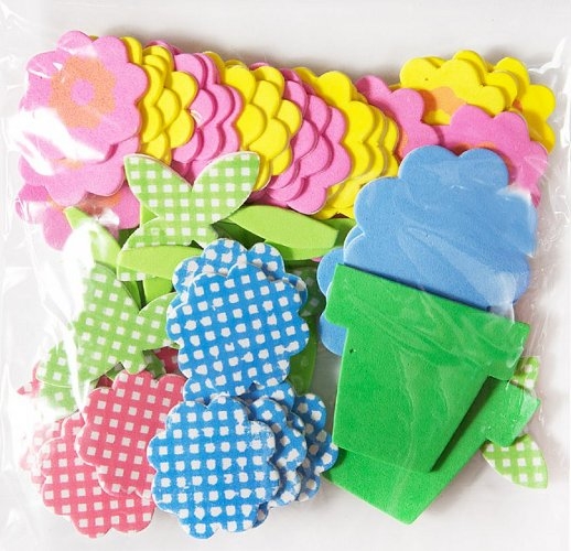 Naklejane kwiaty, doniczki, listki z pianki PVC. Miks rozmiarów, wzorów i kolorów. Opakowanie 60 sztuk. Można ozdobic album, kartki, itp.