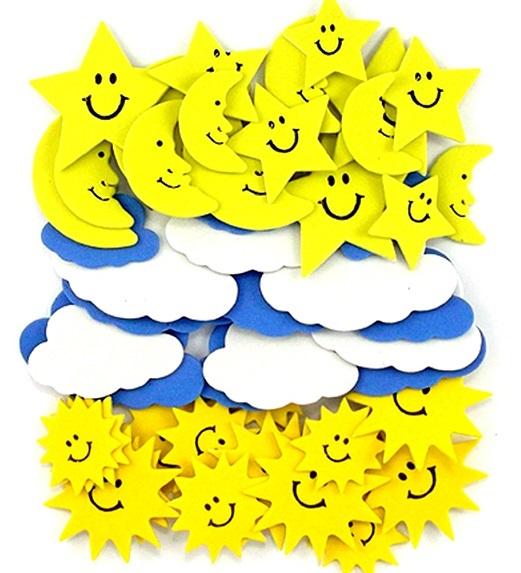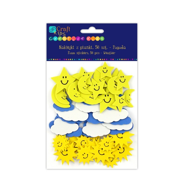 Zestaw naklejek z pianki z motywami obrazującymi warunki pogodowe, w kilku różnych wzorach. Świetnie nadają się do wszelkiego rodzaju dziecięcej aktywności twórczej, jak również do zdobienia projektów kreatywnych takich jak kartki okolicznościowe, albumy, pudełka, opakowania prezentów i wielu innych. Ilość w opakowaniu: 56 szt. Rozmiar: mix