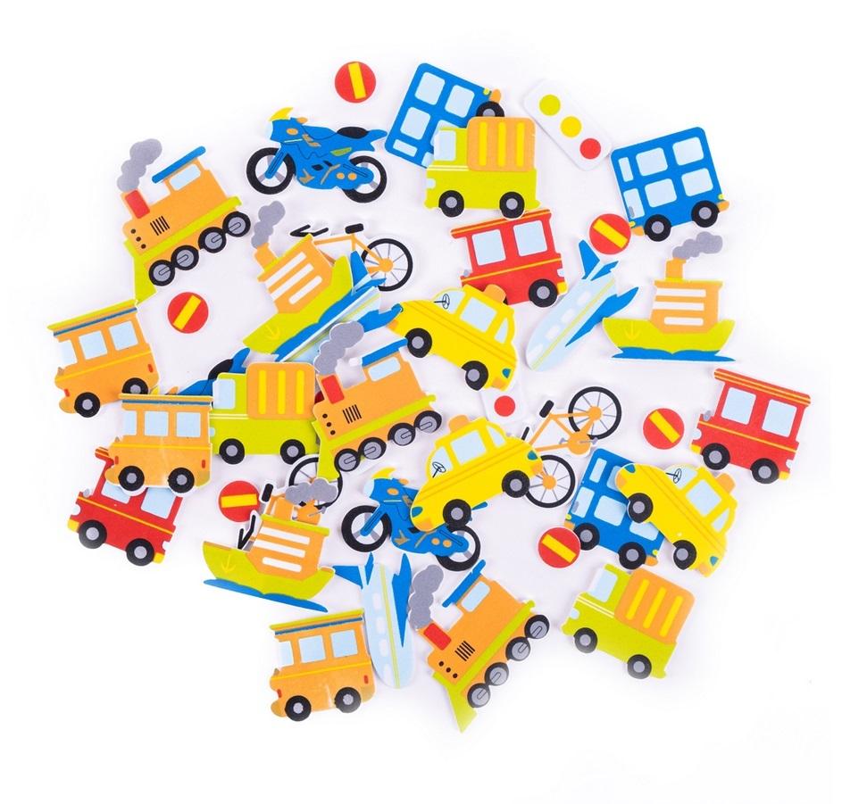 Naklejki z pianki w kształcie pojazdów fantastycznie sprawdzą się podczas wszelkiego rodzaju dziecięcej aktywności twórczej - wykonania obrazków dekoracyjnych, kartek okolicznościowych, albumów dziecięcych, zakładek do książek itp. W zestawie m. in. samoloty, samochody, pociągi, motocykle, rowery i znaki drogowe.