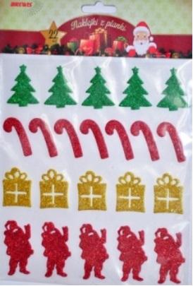 Naklejki z pianki z brokatem nazwa: choinki, mikołaje, prezenty ilość: 22 szt