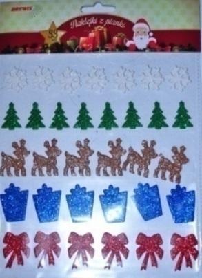Naklejki z pianki z brokatem nazwa: choinki, śnieżynki, renifery, prezenty ilość: 33 szt