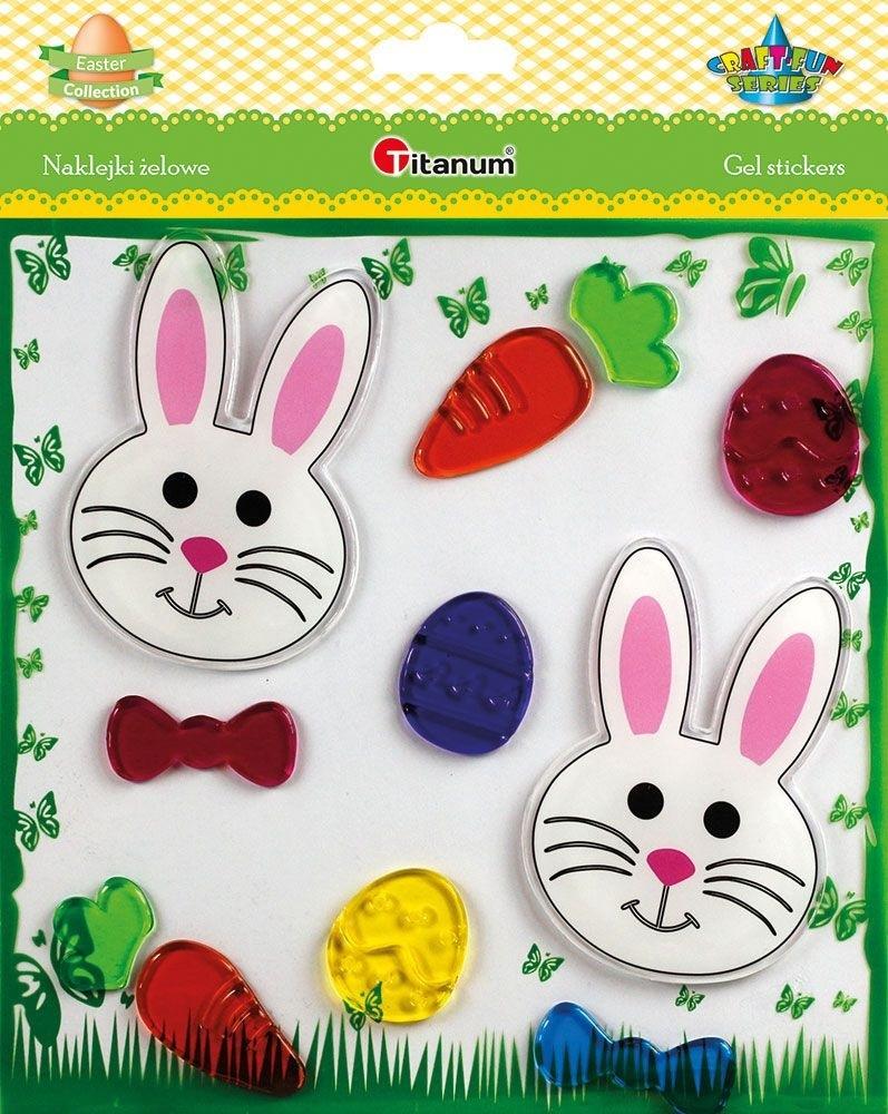 Naklejki żelowe - wielokrotnego użytku, należy je naklejać na gładkie, równe, czyste powierzchnie, takie jak szkło, metal czy lustra. Aby zachować lepkość, po zabrudzeniu przemyć ciepłą wodą i ponownie przykleić. Wzory: głowy królika, pisanki, marchewki, kokardki. 11 sztuk.