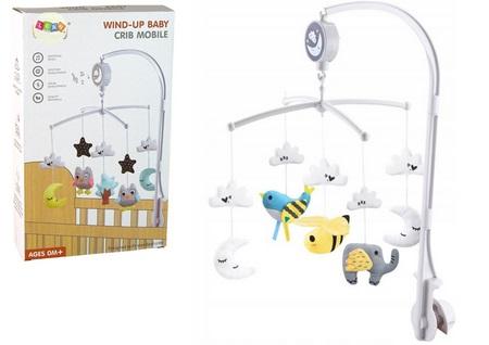 Nakręcana Karuzela Pozytywka Do Łóżeczka Dzieci Karuzelka do łóżeczka z pluszowymi chmurkami to idealna zabawka dla maluszka. Motywem karuzelki są wesołe chmurki, księżyc i kolorowe zwierzątka na pewno spodobają się bobaskowi, a delikatny ruch i spokojna melodia kołysanki będą działały uspakajająco i ułatwią zasypianie. Po nakręceniu karuzelka obraca się o 360, cały czas grając melodię. Posiada włącznik ON/OFF dzięki któremu w razie potrzeby możemy szybko przerwać odtwarzanie kołysanki. Karuzelka została wykonana z wysokiej jakości plastiku. Zawieszki są pluszowe - w razie pobrudzenia można je łatwo zdjąć i wyprać. Dzięki uniwersalnemu uchwytowi karuzelka może być zamontowana w każdym łóżeczku. Zabawka będzie mieć pozytywny wpływ na rozwój maluszka. Poprzez obserwację jednostajnego powolnego ruchu zawieszek, dziecko doskonali zmysł wzroku i rozwija naturalną ciekawość świata. Melodia pozytywnie wpływa na rozwój słuchu, działa relaksacyjnie, maluszek będzie czuł się bezpiecznie. Karuzela z zawieszkami zapakowana jest w ładne opakowanie. Świetnie sprawdzi się jako prezent dla nowego członka rodziny. Zawartość zestawu : -statyw karuzeli - pozytywka - pluszowe zawieszki do karuzeli - oryginalne opakowanie Wymiary karuzeli : 67 cm x 34 cm Maksymalna długość zawieszek : ok.: 35 cm - 41 cm Wymiary opakowania : 31 cm x 19 cm x 7 cm Zestaw przeznaczony jest dla dzieci od pierwszych chwil życia. Zabawki posiadają certyfikat CE i są zgodne z normą EN 71.