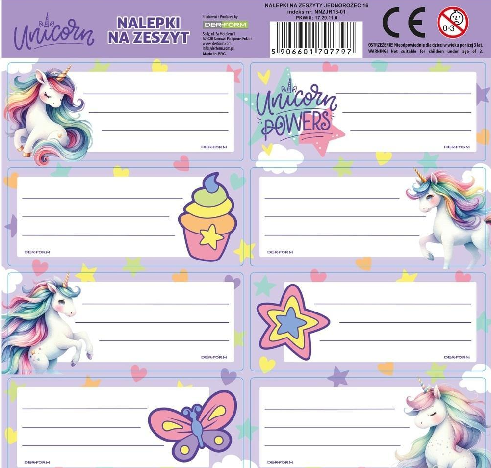 Nalepki na zeszyty Jednorożec 16 (25szt) DERFORM