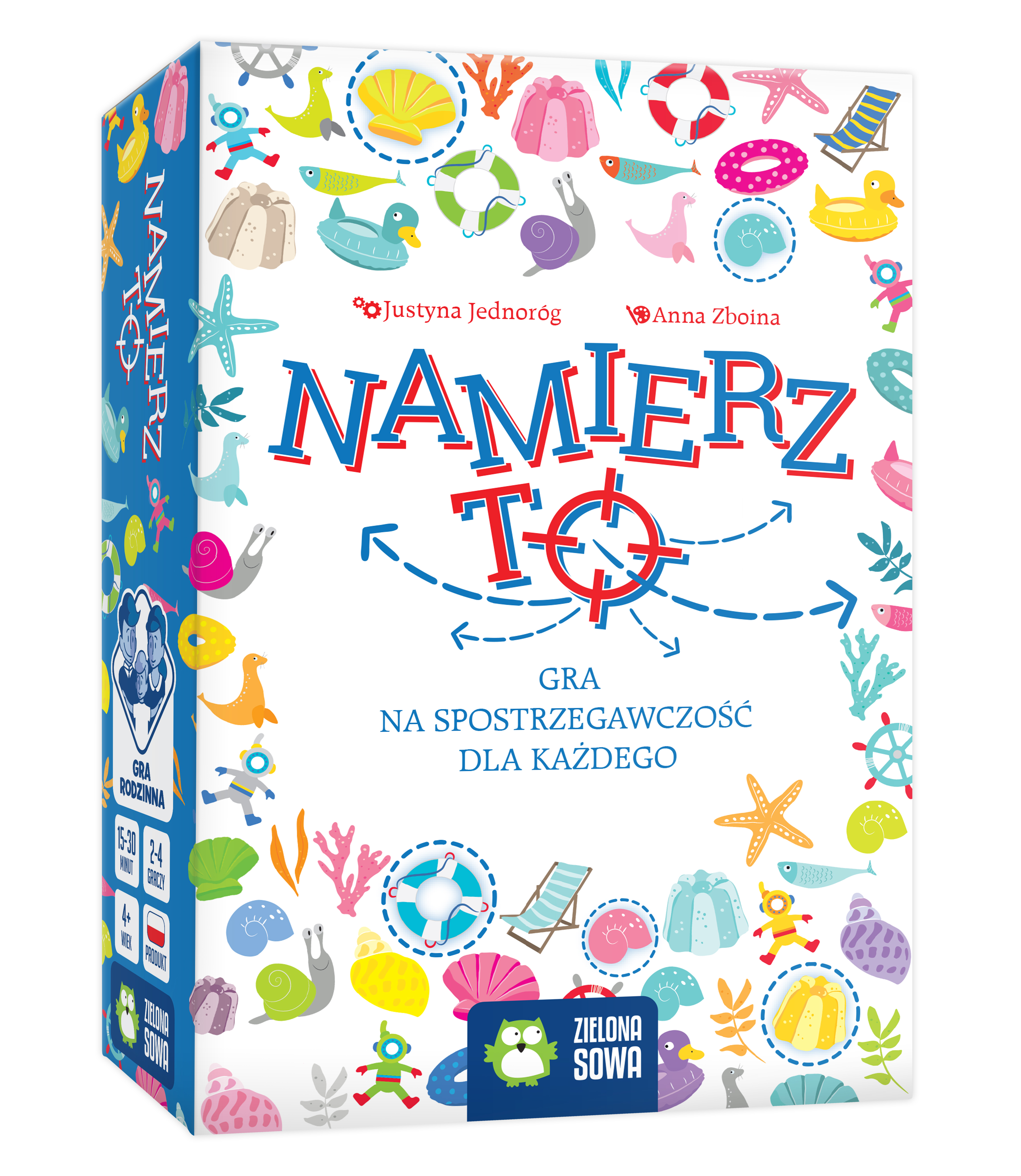 Czy potrafisz zapamiętać wszystkie obrazki z karty? Widzisz nawet najdrobniejsze detale? Wiesz, ile jest na karcie czerwonych krabów, a ile niebieskich motyli? Wykaż się spostrzegawczością i świetną pamięcią! Namierz to! Namierz to wyjątkowa gra karciana dla graczy w każdym wieku. Możesz grać w domu, samochodzie, pociągu, a nawet w samolocie! Baw się jedną grą na trzy sposoby: • zadając szczegółowe pytania do zapamiętanych kart i przepytując się wzajemnie z ich treści, np. Czy na karcie znajduje się czerwony krab? • tworząc dla siebie wyzwania na czas typu: Znajdź …(coś) na karcie, np. Znajdź 4 czerwone kraby, 2 żółte klapki i zieloną palmę. Masz na to 10 sekund • wyznaczając przewodnika gry, który będzie zadawał pytania i ścigając się między pozostałymi graczami w udzielanie poprawnych odpowiedzi, np. Macie 5 minut na odnalezienie 2 czerwonych krabów! Namierzanie może być świetną zabawą! Wiek graczy: 4+ Liczba graczy: 2-4 Czas rozgrywki: 15-30 minut