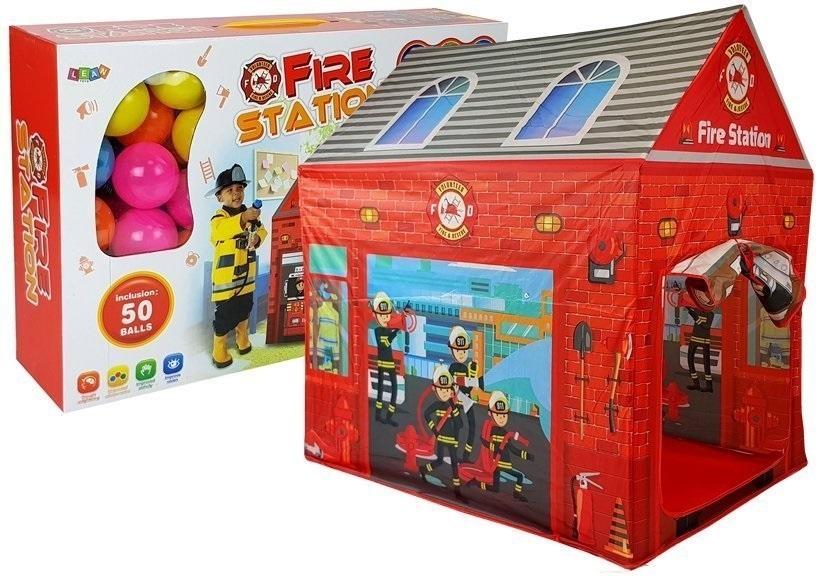 Namiot ma kształt domku z czerwonej cegły, a na nim można zauważyć też charakterystyczne elementy dla STRAŻY POŻARNEJ oraz podobizny strażaków. W zestawie dodatkowo 50 piłeczek w różnych kolorach.