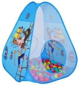 W ZESTAWIE: NAMIOT PIRATA, 100 PIŁECZEK O ŚR. 6 CM., WYMIARY PO ROZŁOŻENIU: 95 X 95 X 100 CM, WYKONANY Z NIEPRZEMAKALNEGO MATERIAŁU, ŁATWY I SZYBKI MONTAŻ, ELASTYCZNY STELAŻ,WYM. OPK: 50 X 16 X 34 CM, 3+
